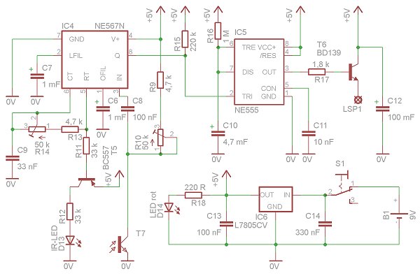 Ob Betriebsspannung an LSP1 anliegt, wird durch eine Reflexionslichtschranke gesteuert. Diese arbeitet durch moduliertes IR-Licht weitgehend fremdlichtunabhängig. Realisiert wird dies durch das Tondecoder-IC NE567. Das Funktionsweise des Tondecoder-ICs ist einfach. Entspricht die Frequenz des an Pin 3 zugeführten Signals der des internen Oszillators des NE567, schaltet der Ausgang Pin 8 auf LOW-Pegel. Das Oszillatorsignal liegt an Pin 5 an, dieses steuert den pnp-Transistor T5 und die IR-LED D13, wobei die Frequenz durch R13, R14 und C9 festgelegt wird. Da es vorkommen kann, dass das Tondecoder-IC auch bei einem Vielfachen seiner Eigenfrequenz anspricht, kann die Eigenfrequenz des ICs bei Fremdlicht gleicher oder einem Vielfachen der Eigenfrequenz einfach über den Trimmer R14 geändert werden. Reflektiert nun ein Gegenstand in der Nähe das Licht, wird dieses auf den Fototransistor T7 zurückgeworfen. Für eine größere Reichweite kann man dazu eine IR-Sende-LED aus einer ausrangierten Fernbedienung verwenden. R9 und R10 bilden den Kollektorwiderstand von T7. Mit dem Trimmer R10 kann die Empfindlichkeit eingestellt werden. Ist die Signalamplitude hoch genug und entspricht das über den Koppelkondensator C8 empfangene Signal der Frequenz des internen Oszillators, so geht der Ausgang (Pin 8) auf LOW-Pegel und steuert den nachfolgenden, als Monoflop beschalteten, NE555 an. Die Ausgangsimpulslänge ist durch C10 und R16 definiert und lässt sich über die Formel t ≈ 1,1 * R16 * C10 (t in s, R in MOhm, C in μF) näherungsweise bestimmen. In unserem Fall bleibt der Ausgang (Pin 3) des Monoflops bei jedem ausreichend an die Reflexionslichtschranke genäherten Gegenstand etwa 5 Sekunden auf HIGH-Pegel und somit auch der Transistor T6 durchgeschaltet, wodurch +5 V Betriebsspannung an Punkt LSP1 gelangt und der Vogel zu singen und sich zu bewegen beginnt.