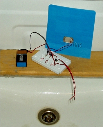 die zwei angeschlossenen Drähte ins Wasser taucht. Der verstärkte Strom