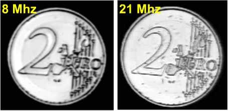Die Bilder der Münze bei 8 MHz und 21 MHz zeigen die höhere Auflösung mit steigender Frequenz und damit kleiner werdenden Wellenlänge. Eine Besonderheit des Ultraschalls ist dass er in Materialen eindringen kann sodass wie in der Röntgentechnik Strukturen im Innern abgebildet werden können. Gut kann man das an dem Platinenscan sehen auf dem die kreuzweisen Lagen der Glasfasern im Expoxidmaterial gut zu sehen sind
