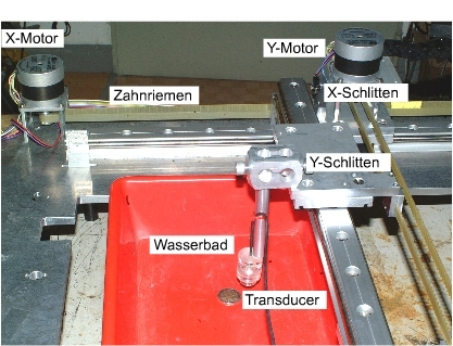 Um ein Bild aufzunehmen wird der Transducerkopf über den im Wasserbad liegenden Gegenstand gerastert. Der Verfasser verwendete einen selbstgebauten XY-Tisch zur Rasterung. Der Tisch besteht im wesentlichen aus zwei Linearführungen von Isel, deren Schlitten von Schrittmotoren über Zahnriemen angetrieben werden.