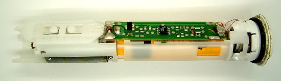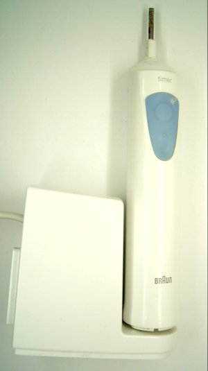 Die Zahnbürste enthält zwei Akku-Zellen mit zusammen 2,4 V. Im Fuß befindet sich eine Spule, über die Energie vom Ladegerät aufgenommen wird. Die Ladeschaltung verhindert das Überladen des Akkus und schaltet den Motor zwangsweise ab, solange das Ladegerät in Reichweite ist.