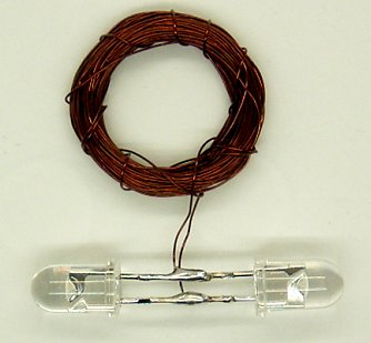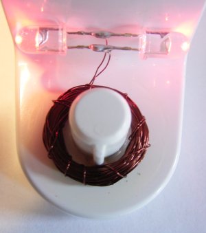 Auch das Ladegerät allein ist noch brauchbar. Es erzeugt ein magnetisches Wechselfeld mit ca. 20 kHz und bildet so etwas wie die eine Seite eines Trafos. Man muss also nur noch die Sekundärwicklung anbringen. Mit 100 Windungen CuL 0,3 mm können zwei antiparallel angeschlossene LEDs beleuchtet werden. So wird aus dem Ladegerät ein sparsames Nachtlicht.