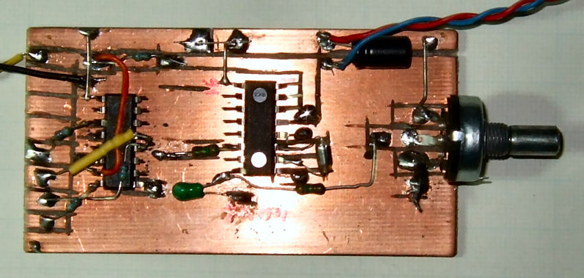 Mehrere Bereiche werden oft durch Umschaltung des Kondensators C3 realisiert, aber das ist bei HF ungünstig, lange Leitungen und Handeffekte stören da. Deshalb wird hier ein Frequenzteiler mit einem 74HC4040 eingebaut, an den Ausgängen kann man dann den Frequenzbereich rückwirkungsfrei umschalten, z.B. an Q10 von 1,1 bis 25 kHz. Der Aufbau erfolgt im dead-bug style auf einer Platine mit handgefrästen Leiterbahnen, das sieht nicht gut aus aber es geht schnell und hat Vorteile bei HF.