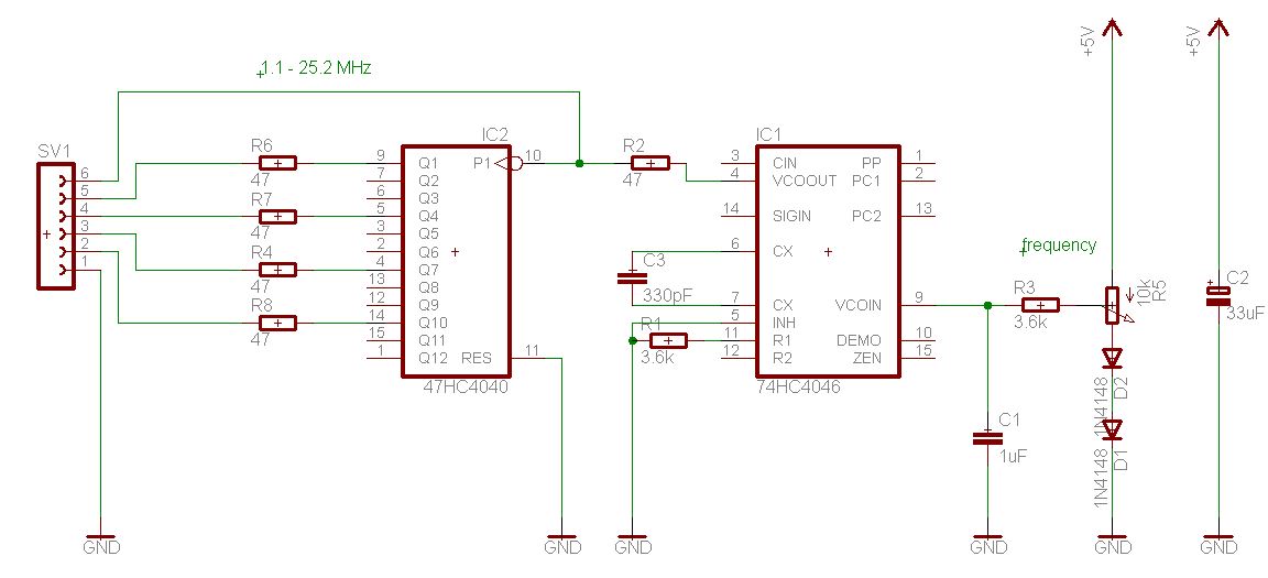 Neben DDS und anderen HF-Generatoren ist manchmal auch ein einfacher Rechteckgenerator ganz nützlich. Der ist mit Standardbauteilen aufgebaut, mit einem 74HC4046 als Oszillator und hat einen weiten Abstimmbereich von 1,1 bis 25,2 MHz in einem Rutsch. Insgesamt hängt der Bereich vom IC und dem Hersteller ab. Your mileage may vary.