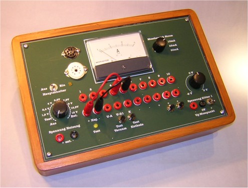 Die Anodenspannung beträgt 12 V, Grundgedanke ist, zusammen mit der regelbaren Gitterspannung von -9-+9 Volt Röhren auf Ihre Verwendbarkeit für kleine Spannungen zu prüfen. Der Vakuum-Test ist ein 1M Widerstand mit parallelem Taster (Öffner) in der G1 Zuleitung. Prinzipiell ist die Schaltung angelehnt an den Taschenröhrenprüfer aus Jogis Röhrenseite.