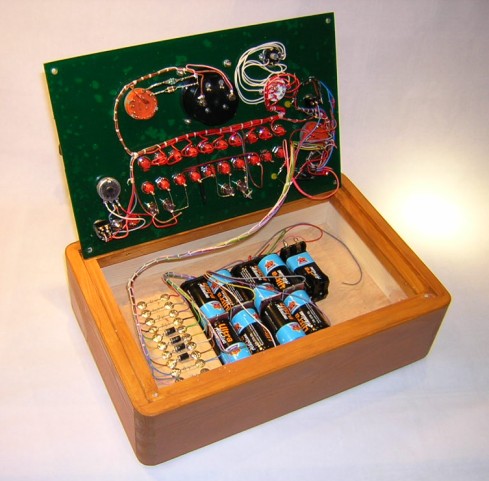 Den Aufbau habe ich bewusst an alte Zeiten angelehnt, daher auch das Gehäuse aus Holz und die konventionelle Verdrahtung mit Kabelbaum. Mir hat es sehr viel Spaß gemacht, dieses einfache Prüfgerät zu bauen und nach langer Zeit mal wieder ein Gefühl für alte und "grobe" Technik zu bekommen. Es müssen wirklich nicht immer IC`s und Transistoren sein ;-).