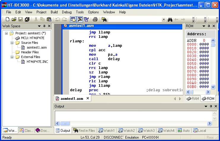 Und nun ein Blick auf die Entwicklungsumgebung HT-IDE-3000 mit Assembler und C-Compiler, die man kostenlos herunterladen kann. So eine neue Software braucht immer erst etwas Eingewöhnung. Also habe ich mir die vorhandenen Beispiele angesehen. Da gibt es z.B. ein Assembler-Beispiel HA0009.ASM für ein Lauflicht, allerdings für einen etwas anderen Controller.