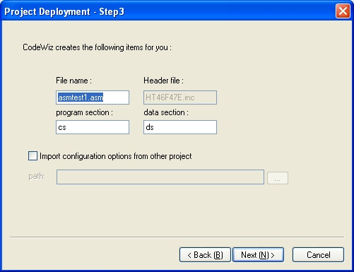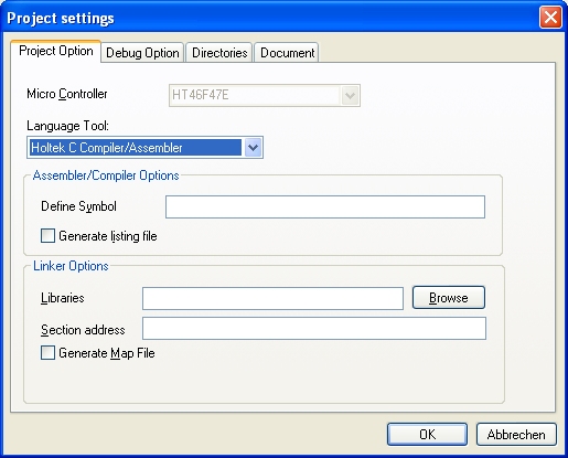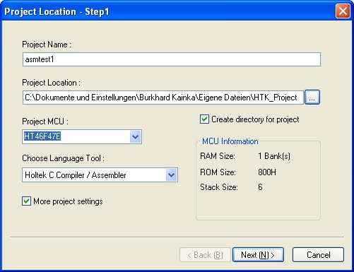 Die erste Aufgabe sollte es werden, es an den HT46F47E anzupassen. Also wie geht es los? Ein neues Projekt öffnen, dazu gibt es wie in anderen Umgebungen einen kleinen Helfer. Zuerst wählt man einen Namen, den gewünschten Controller und den Programmtyp C oder Assembler.