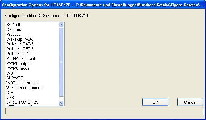 Unter anderem werden die Configuration Options eingestellt, das ist so etwas wie die Fuses beim AVR, also Dinge wie Watchdog, Spannungsüberwachung und besondere Port-Verwendung. Man kann zuerst mal alles in der Grundeinstellung lassen.
