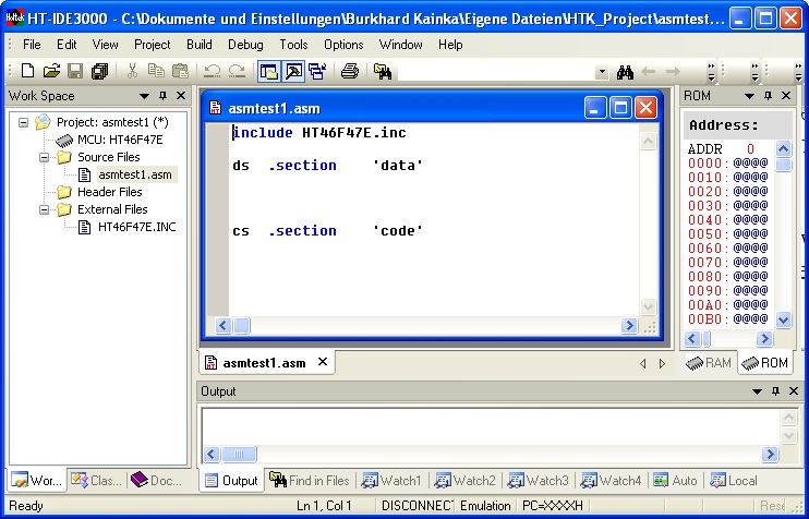 Am Ende hat man ein vollständiges Projekt mit einem leeren Quelltext. Darin ist die Include-Datei für den Zielprozessor angegeben und eine data- sowie eine code-section vorbereitet. In den leeren Quelltext wird nun der vorhandene Quelltext eingefügt, dabei aber die Definitionsdatei für den neuen Controller gelassen. Wenn man schon mal mit dem 8051 und mit AVR in Assembler gearbeitet hat, sieht das alles irgendwie bekannt aus.  Im Datenblatt zum Controller findet man die Auflistung der Assemblerbefehle. Es sieht aus, als könnte man damit klarkommen.