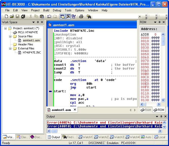 Der erste Versuch, das Programm zu kompilieren (Build), bringt allerdings eine Menge Fehlermeldungen. Es geht irgendwie um das Label „start:“. Erst nach längerer Suche kam ich darauf, dass der neue Controller über ein Steuerbit mit dem Namen Start im Zusammenhang mit dem AD-Wandler verfügt. Da gibt es also eine Kollision. Ein neuer Name (starten)  für das Label löst das Problem. Das selbe passierrt mit dem Label d1, das in ziel1 umbenannt werden muss.  Das Programm sieht nun so aus: