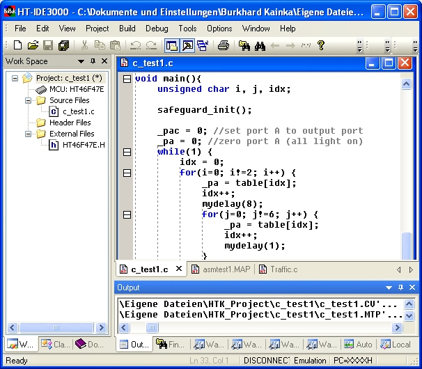 Nun soll der C-Compiler ausprobiert werden. Wieder habe ich ein vorhandenes Programm als Ausgangspunkt genommen. Es realisiert eine Verkehrsampel. Auch hier gab es bei der Umstellung auf den andern Controller zunächst kleinere Probleme. Diesmal war die Ursache, dass der ursprünglich eingesetzte Controller mehr Ports hatte als der HT46F47E, Port C musste herausgenommen werden. Hier das angepasste Programm:
