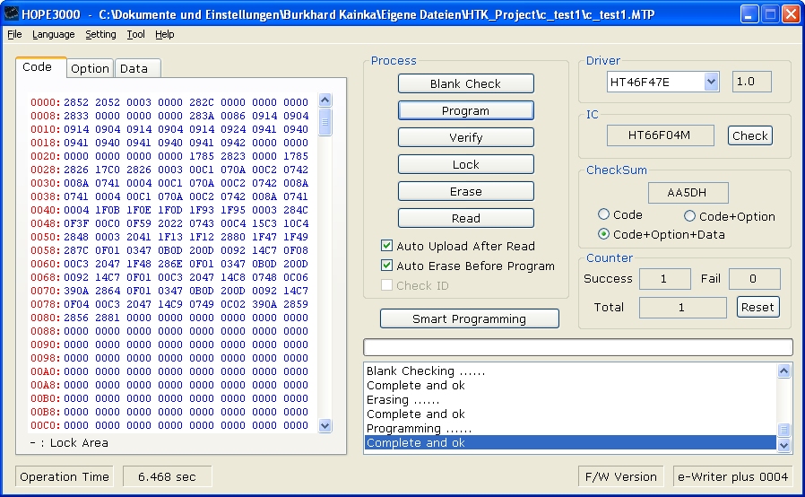 Check" und dann "Program". Erfolgsmeldung!