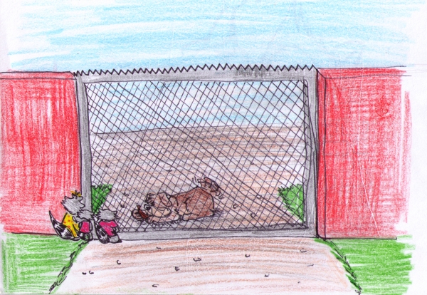 Max das erste Würstchen im hohen Bogen über den Zaun. Der große Hund machte