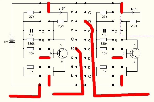 Etwas heller leuchten die LEDs wenn man vor die Basis die 10K Widerstände setzt.