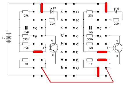 Connect the 27k resistor of the right block to +. The red LED comes on