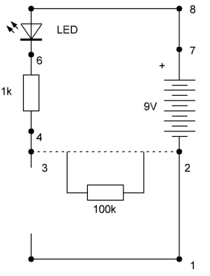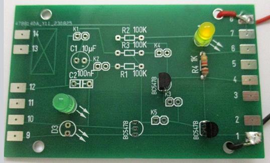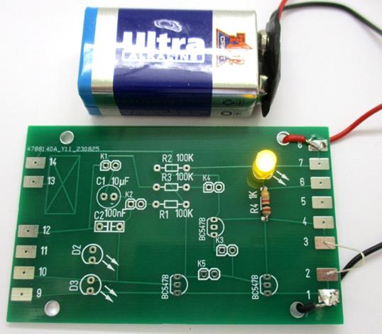 Nach dem Anschließen einer Batterie bleibt die LED zunächst aus, weil der Stromkreis noch nicht geschlossen ist. Erst mit einer Drahtverbindung zwischen Anschluss 2 und 3 geht die LED an. Später soll der rechte Transistor BC547B die Verbindung herstellen. Testweise kann der Kontaktdraht auch mit derselben Wirkung in die äußeren Lötlöcher für diesen Transistor gesteckt werden.
