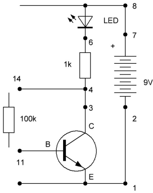 Der Transistor ist nun eingebaut, aber die LED leuchtet zunächst noch nicht. Wenn man aber einen Widerstand mit 100 kΩ zwischen 11 und 14 setzt, geht sie an. Durch den Widerstand fließt nun ein kleiner Strom zur Basis des Transistors. Er wird kräftig verstärkt, sodass durch den Kollektor und den Emitter ein größerer Strom fließt. Damit ist die LED eingeschaltet. Zum Vergleich: Wenn der Widerstand von 100 kΩ den LED-Strom direkt leitet, ist das Licht sehr schwach. Wenn der Widerstand aber den Steuerstrom durch die Basis leitet, sorgt die Verstärkung durch den Transistor für volle Helligkeit. Die Stromverstärkung des Transistors wird weiter unten noch im Detail untersucht.