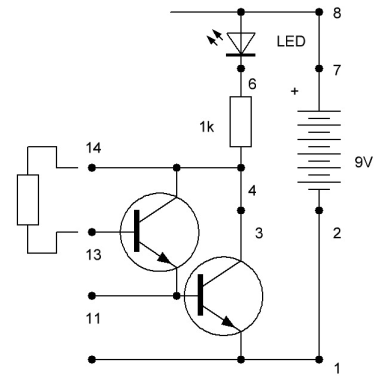 Auch die Hand kann wieder als Widerstand dienen. Berührt man gleichzeitig Anschluss 12 und 14, leuchtet die LED schon gut sichtbar, aber noch nicht voll. Die Schaltung ist also bereits ein Berührungssensor, der aber noch weiter verbessert werden soll.