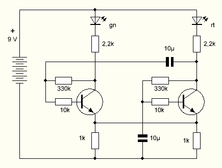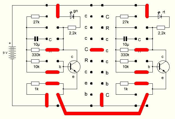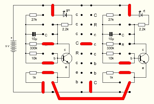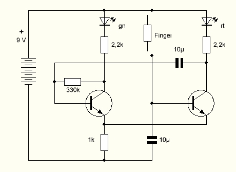 Und noch ein Umbau: Der rechte Transistor verliert seinen Basiswiderstand. Ersatz schafft eine Berührung der Kontakte mit dem Finger. Nun kann man durch mehr oder weniger starke Berührung die Schwingungen beeinflussen.