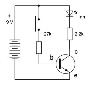Die Grundfunktion des Transistors ist nicht schwer zu verstehen. Der Emitter (e) soll an den Minuspol der Batterie anschlossen werden, der Kollektor(c) mit einem Verbraucher in Reihe an den Pluspol. Der Verbraucher besteht in diesem Fall aus der LED mit ihrem Vorwiderstand. Im Grundzustand ist der Transistor ein Nichtleiter, es fließt also kein Strom. Wenn man aber einen kleinen Strom durch den Basisanschluss (b) leitet, fließt ein sehr viel größerer Strom durch den Kollektor und den Emitter. Ein kleiner Basisstrom wird also zu einem großen Kollektorstrom verstärkt. Der Kollektorstrom kann 500-mal größer sein als der Basisstrom. Man sagt dann, dass der Transistor eine 500-fache Stromverstärkung hat.