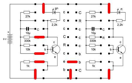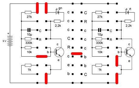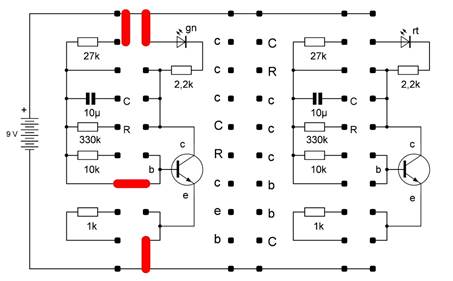 Damit diese Verbindung mit Jumpern möglich ist, muss man einen Umweg über den rechten Transistor nehmen. Dessen Basis und Emitter werden nach Minus verbunden. Dann kann ein Jumper zwischen c (links) und b (rechts) auf der mittleren Kontaktleiste die Verbindung schließen. Der Kollektor des linken Transistors wird also mit dem Minuspol verbunden. Aber wird die LED dadurch noch heller? Nein! Das Ergebnis lautet also, dass der Transistor allein schon ein sehr guter Schalter ist.
