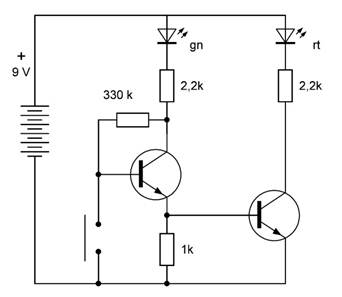 Bei einer Alarmanlage kommt es darauf an, dass sie den Alarm sehr deutlich anzeigt und dass die Batterie möglichst lange hält. Diese Schaltung leistet beides. Durch den großen Basiswiderstand von 330 kΩ wird nur ein sehr kleiner Ruhestrom von rund 20 µA gebraucht. Und dieser kleine Strom fließt auch durch die grüne LED, die dauernd schwach leuchtet. Damit hat man zusätzlich eine Bereitschaftsanzeige. Aber wenn die Drahtbrücke entfernt wird, reicht der Strom für eine große Aussteuerung des linken Transistors aus, der dann gleichzeitig auch den rechten Transistor einschaltet. Im Alarmfall leuchten also beide LEDs hell auf.