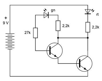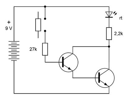 Eine andere Version dieser Schaltung legt den Basiswiderstand nicht an den Kollektor sondern an Plus. Diesmal wird der 27-kΩ-Widerstand verwendet. Auch durch ihn fließt im Aus-Zustand ein Strom, aber er fließt eben nicht durch die LED. Deshalb geht die LED diesmal vollständig aus. Aber weil der Strom durch den neuen Basiswiderstand wesentlich größer ist, braucht man auch einen größeren Sensorstrom am Eingang des ersten Transistors. Die Berührung muss also etwas niederohmiger ausfallen. Es kann sogar nötig sein, den Finger für den Versuch leicht anzufeuchten, damit die rote LED wirklich ausgeht.