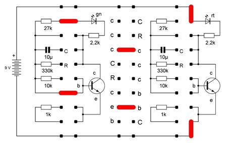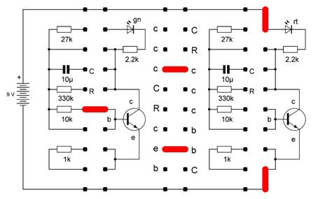 Mit einer Berührung konnte bisher schon eine LED eingeschaltet werden. Aber es geht auch anders herum. Nun soll die LED im Ruhezustand an sein, aber ausgehen, wenn man die Kontakte berührt. Die Aufgabe erinnert etwas an die Alarmanlage. Dort war die Lösung, die Basisspannung kurzzuschließen. Und diesmal ist es genauso, mit einem kleinen Unterscheid. Der Kurzschluss wird nicht durch einen Draht oder eine Steckbrücke erreicht, sondern durch den linken Transistor. Wenn er leitet, schaltet der den rechten Transistor ab.
