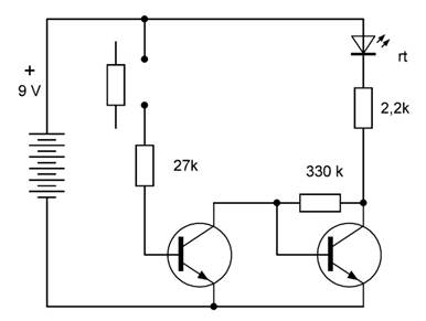 Eine LED leitet den Strom in Durchlassrichtung und sperrt ihn in Gegenrichtung. Aber wenn Licht von außen auf den LED-Kristall fällt, fließt auch in Sperrrichtung ein kleiner Strom. Er ist allerdings sehr viel kleiner als ein Mikroampere und wird meist überhaupt nicht bemerkt. Mit einer Darlingtonschaltung hat man jedoch so viel Verstärkung, dass der verstärkte Strom eine LED deutlich zum Leuchten bringt. Je heller es ist, desto heller leuchtet auch die rote LED.