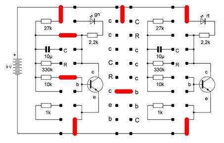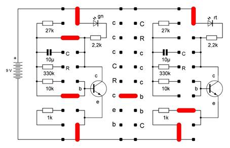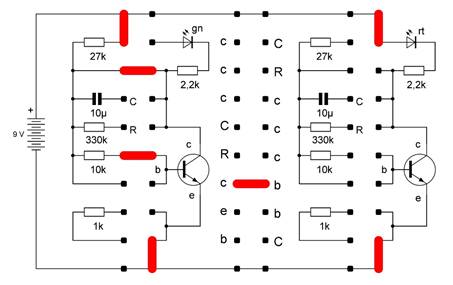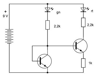 In diesem Fall wird der Strom durch die grüne LED überwacht und mit der roten LED angezeigt. Weil die Kontroll-LED weniger hell sein soll als die überwachte LED, wird die Emitter-Gegenkopplung eingesetzt. Sobald man den Strom durch die grüne LED unterbricht, geht auch die rote LED aus.