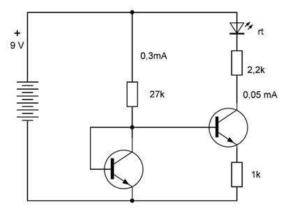 Der rechte Transistor bekommt dieselbe Basisspannung. Unter der Voraussetzung, dass er genau gleiche Daten hat, fließt dann auch durch ihn ein gleich großer Strom. Die LED wird also mit dem Strom von 0,3 mA betrieben. Man sieht eine geringe Helligkeit. Wenn man den zweiten 27-kΩ-Widerstand dazuschaltet, verdoppelt sich der LED-Strom auf 0,6 mA.