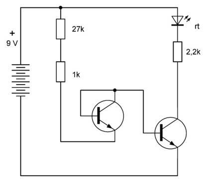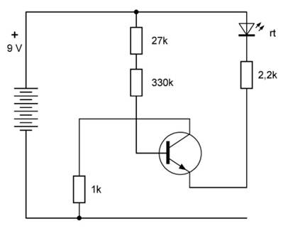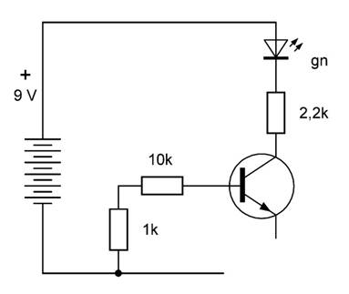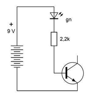 roten LED. Wenn man den Basisstrom über den 27-kΩ-Widerstand einschaltet,