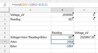 A linear relationship was used: Voltage in microvolts = 3164 * ADC_reading - 3161.