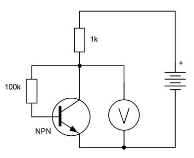 Um zu erfahren, wie stark der Transistor den Basisstrom verstärken kann, muss der Versuchsaufbau etwas angepasst werden. Die Schaltung hat nun nur einen Transistor und zwei Widerstände. Wichtig ist, dass der Basiswiderstand zwischen Basis und Kollektor eingesetzt wird. Damit erreichst du, dass der Transistor noch nicht voll eingeschaltet ist. Miss nun wieder die Spannungen an den drei Anschlüssen des Transistors.