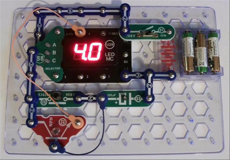 Hier wird auch wieder die Entladung des Kondensators gemessen. Baue den Transistor ein, so dass er den Messstrom verstärkt. Dann fließt nur noch ein sehr kleiner Basisstrom, der den Elko nur sehr langsam entlädt. Allerdings zeigt das Messgerät nun etwa 0,5 V weniger an, denn so viel Spannung braucht der Transistor zwischen seiner Basis und dem Emitter. Die höchste Spannung wird also mit 4,0 V angezeigt. Die Entladung ist zwar langsamer, aber wieder am Anfang schnell und dann immer langsamer.