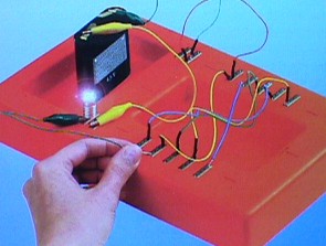 und zwei Materialfächer. Man baut einfache Stromkreise auf und führt