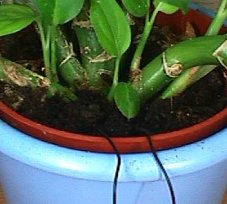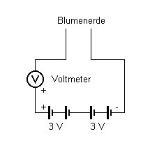 Wenn du schon einige Versuche mit deinem Baukasten durchgeführt hast, wird es dich sicher wundern, wie hier das Voltmeter angeschlossen wird. Tatsächlich wird es wie ein Amperemeter verwendet. Das Voltmeter in deinem Schaltpult hat einen Innenwiderstand von 20 Kiloohm. Bei Vollausschlag fließt deshalb ein Strom von 0,5 Milliampere durch das Gerät. Der Messbereich ist also 1000 mal kleiner als der des Amperemeters in deinem Baukasten. Das ist für diesen Versuch wichtig, weil nur wenig Strom durch die Blumenerde fließt. Wie es funktioniert, kannst du am Computer untersuchen.