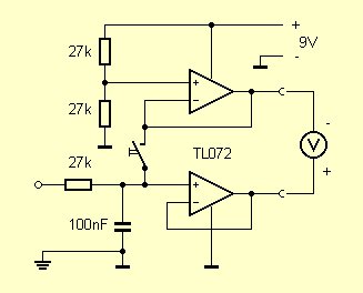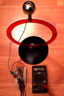 Das Prinzip der Messung ist, dass eine geladenen Matallplatte aus dem Baukasten über einen Kondensator mit 100 Nanofarad entladen wird. Er lädt sich dabei etwas auf. Nun muss man nur noch die Spannung am geladenen Kondensator messen. Dafür ist allerdings ein besonders hochohmiger Pufferverstärker notwendig, weil jedes direkt angeschlossene Voltmeter den Kondensator sofort entladen würde. Die Schaltung des Messverstärkers ist so ausgelegt, dass Ladungen beider Polaritäten gemessen werden können. Ein Tastschalter bewirkt eine Entladung und damit ein Zurücksetzen auf Null.