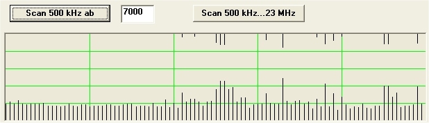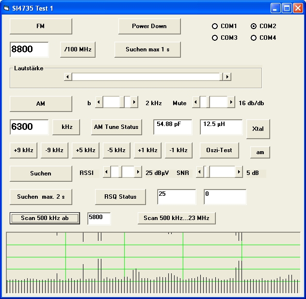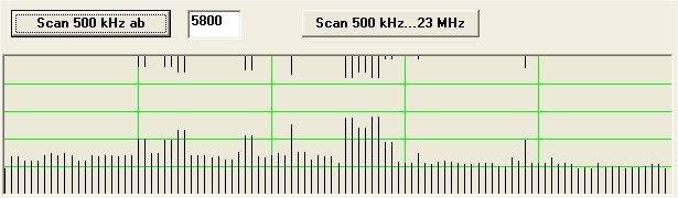 Für das Starterkit zum SI4735 gab es eine umfangreiche Software, die auch das Scannen des gesamten AM-Bereichs erlaubte. Ich wurde oft gefragt, ob so etwas auch mit dem Platinchen von Modul-Bus möglich ist. Klar, alles geht! Als Basis habe ich die vorhandene VB-Software aus ELEXS genommen und eine Scan-Funktion mit eingebaut. Man kann nun wahlweise ein einzelnes Band durchsuchen oder den gesamten Bereich bis 21,85 MHz. Von unten wird die Signalstärke angezeigt, von oben das SNR, beide mit 20 dB/Skt. Empfangbare AM-Stationen erkennt man am Strich von oben (SNR). Das Bild zeigt einen Scan des 49-m-Bandes ab 5,8 MHz gegen 17 Uhr. Der allgemeine Rauschpegel liegt schon bei über 20 dBµV (10 µV), aber einige Stationen erreichen fast 60 dBµV (1 mV).