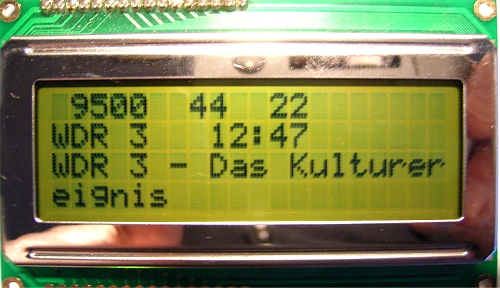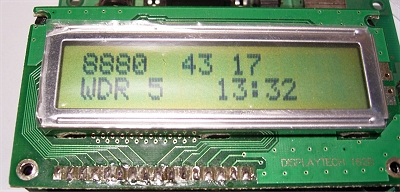 Das LCD auf dem ES-M32 ist üblicherweise zweizeilig und wird anders angesteuert als beim ATM18. Im Beispiel wird die Stationskennung und die Uhrzeit ausgegeben. Es stehen vier Tastschalter zur Verfügung, deshalb wurde auch Kurzwelle mit bedient.  S1 bedient die UKW-Abstimmung, S2 die für Kurzwelle.