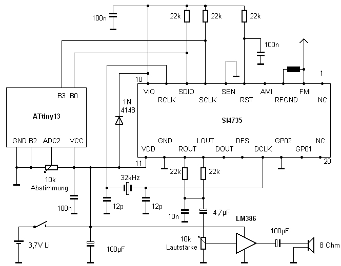 Das Radio wird mit einer Li-Zelle mit 3,7 V betrieben. Die Spannung an Vio soll nicht über 3,6 V liegen. Deshalb wurde eine Si-Diode eingefügt, die die Betriebsspannung um ca. 0,6 V reduziert. Das Radio enthält einen kleinen Audioverstärker LM386. Die Stereosignale werden zusammengeführt und durchlaufen einen Tiefpass zur Anpassung der Klangeigenschaften des relativ kleinen Lautsprechers.
