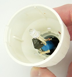 Das Thema ist ja gerade hochaktuell, weil in Australien Glühlampen verboten wurden. Gut, Energiesparlampen haben einen besseren Wirkungsgrad. Aber die Zukunft liegt in LEDs. Eine defekte Energiesparlampe habe ich deshalb zur LED-Lampe umgebaut. Als "Vorwiderstand" dient ein Kondensator mit 0,1 µF, der bereits vorher zur Entstörung in der Lampe eingebaut war. Zusätzlich liegt noch ein Widerstand von 300 Ohm in Reihe, um steile Impulse abzufedern. Dazu noch ein kleiner Vierweggleichrichter und eine superhelle weiße LED. Fertig ist die Lampe mit E27-Sockel und für 230 V. Sie ist nicht so hell wie das Original aber noch viel sparsamer.