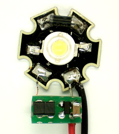 1-W-Power-LED, die nun an einer Akkuzelle läuft. Das Bild zeigt