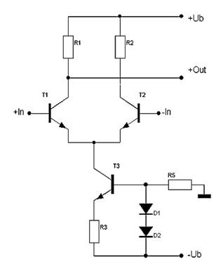Heute wird als Eingangsstufe fast immer ein Differenzverstärker mit zwei Transistoren eingesetzt, deren Emitter miteinander gekoppelt sind. Die beiden Basis-Anschlüsse bilden die zwei Eingänge – die anders als bei der Emitterschaltung gleiche Eingangsimpedanzen aufweisen. Der Stromfluss durch die beiden Transistoren wird durch einen Widerstand oder – heute meistens und wie im Schaltbild unten gezeigt – durch eine Konstantstromquelle eingestellt. Dieser Ruhestrom entscheidet zum Beispiel über das Rauschverhalten der Stufe und auch darüber, wie viel Ausgangsstrom zur Ansteuerung der folgenden Verstärkerstufe zur Verfügung steht. Ein solcher Differenzverstärker wird immer mit zwei gleichgepolten Transistoren (NPN oder PNP) aufgebaut. Im angloamerikanischen Sprachraum spricht man von einem long-tailed pair – einem Paar mit langem (gemeinsamen) Schwanz.