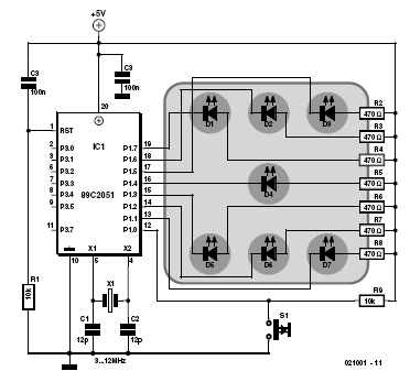In der Reset-Schaltung des Würfels (genau wie in Elektor 4/2002) hat sich leider ein Fehler eingeschlichen: Reset ist aktiv high, also muss C3 nach +5V und R1 nach Masse, wie es das berichtigte Bild zeigt. Dank an Günther Zöppel, der den Fehler entdeckt hat!