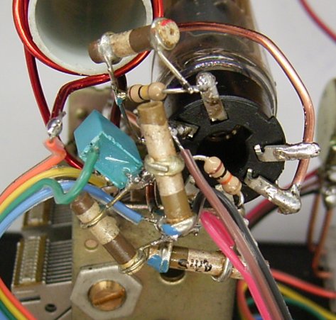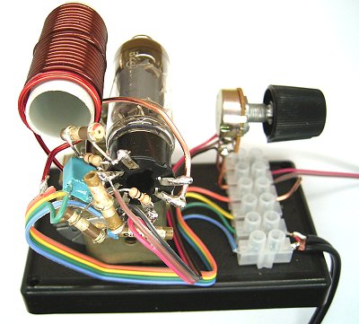 Die Stabilität steht und fällt mit dem Schwingkreis. Also wurde eine kräftige Spule mit 20 Windungen aus 1,5 mm dickem Draht auf ein PVC-Rohr mit 18 mm Durchmesser gewickelt. Mit kurzen Verbindungen zum Luftdrehko erhält man eine hohe Leerlaufgüte weit über 300. Auch alle anderen Verbindungen sind sehr stabil ausgelegt. Nichts darf wackeln oder mechanisch schwingen. Sogar die Röhre wurde an ihrem Glasstutzen schwingungsdämpfend abgestützt.