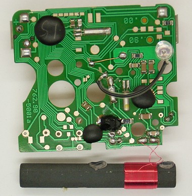 Nach etwas Probieren war klar: Der Einschalt-Eingang muss permanent an Masse gelegt werden, wozu ein Kupferdrähtchen eingesetzt wurde. Die vierte Leitung ist dann der Ausgang. Hier erscheinen die positiven Impulse des Zeitzeichensignals. Damit man etwas sieht, habe ich eine superhelle LED gegen Masse angeschlossen. Statt 1,5 V muss die Platine nun mit 3 V betrieben werden. Und tatsächlich: Man sieht jede Sekunde einen schwachen Lichtblitz, wobei der letzte Impuls in jeder Minute ausbleibt. Das reicht schon, um den Anfang einer Minute zu erkennen. Wenn man noch genauer hinsieht, erkennt man kurze Impulse (100 ms) und lange Impulse (200 ms). Damit wird die Uhrzeit in digitaler Form gesendet.