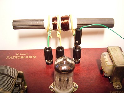 Mit anderen Ferritstäben muss man vielleicht etwas probieren, bis man die richtige Frequenz trifft. Manchmal hilft es, die nicht verwendete Hälfte des Drehkos mit anzuschließen. Man kann auch weitere Kondensatoren parallel schalten oder die Antenne über einen Koppelkondensator anschließen. Beim Bau eigener Spulen beobachtet man oft, dass die Rückkopplung schon bei sehr kleiner Anodenspannung einsetzt. Dann sollte man die Kathodenwicklung verkleinern, um einen günstigeren Arbeitspunkt zu erreichen. Auf dem Ferritstab waren die Ergebnisse mit nur 30 Windungen wesentlich besser. Der Regler muss nun etwa halb aufgedreht werden.