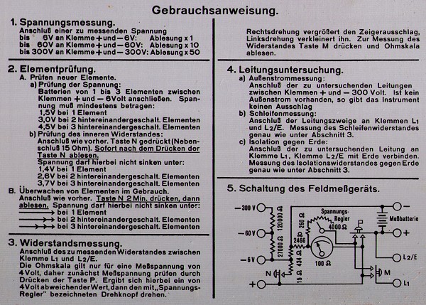 Die Bezeichnung "Feldmessgerät" war Ausgangspunkt für eine Suche im Internet. In Jogis Röhrenbude gab es die gesuchten Informationen. Es handelt sich um ein Messgerät der deutschen Wehrmacht und ist damit über 60 Jahre alt. Ich habe die Spannungsbereiche überprüft: Es ist alles noch so genau wie am Anfang.